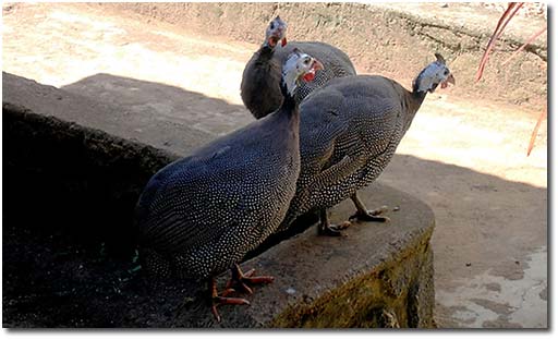Das war also ein Leben auf dem Lande im winzigen Ort Mangengenge, dazu gehörte ein Garten mit einem Hühnerhof, der neben den Hühnern auch Perlhühner und Enten beherbergte. Für die Nacht und zum Eierlegen hatte das Federvieh ein Haus auf Stelzen, das sie über die bekannte Hühnerleiter erreichten. Das hilft gegen die Schlangen, die sich gern als Eierdiebe hervortun und auch schon mal ein Huhn erlegen. Gefüttert wurde mit Küchenabfällen von Obst und Gemüse, auch ein welkes Bananenblatt oder sogar Styropor wurden nicht verschmäht. Das Füttern mit Papaya aber wird mit dem schönsten Eigelb von fast orangener Farbe belohnt.